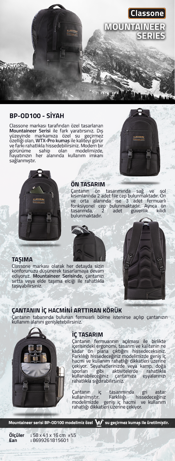 Classone Mountaineer Serisi Sırt Çantası - Siyah